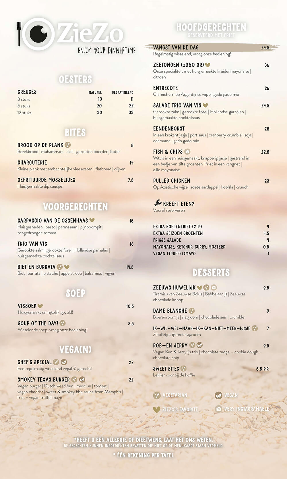In ons Zeeuwse restaurant staat proeven, genieten en gezelligheid in een strand ambiance bovenaan. Als echte Zeeuwen werken wij natuurlijk met de beste en mooiste producten. Producten met een goed verhaal. Met zorg voor dier en milieu.
